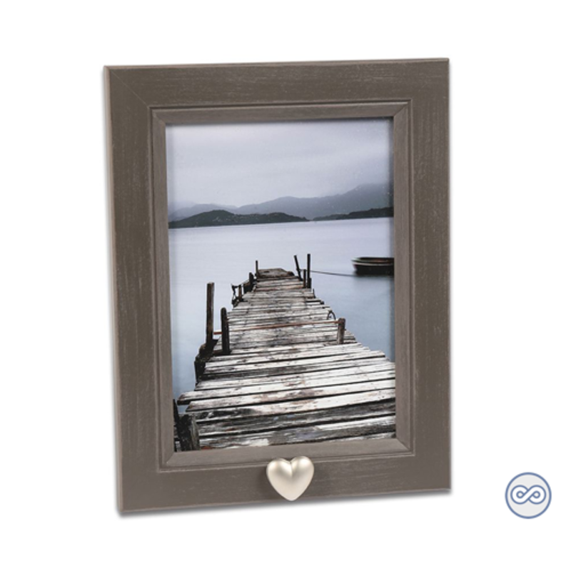 Deze bruine fotolijst heeft ruimte om as te bewaren van een overledene (in het hartje aan de onderkant). Door het hartje is het de mooiste optie om de fotolijst in een staande positie te plaatsen of op te hangen.