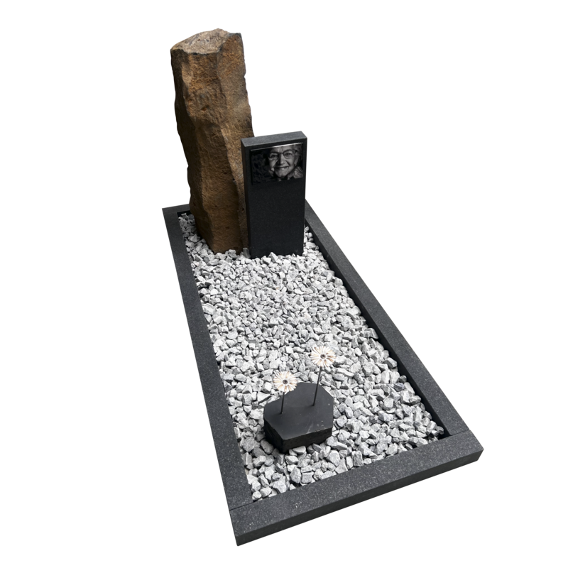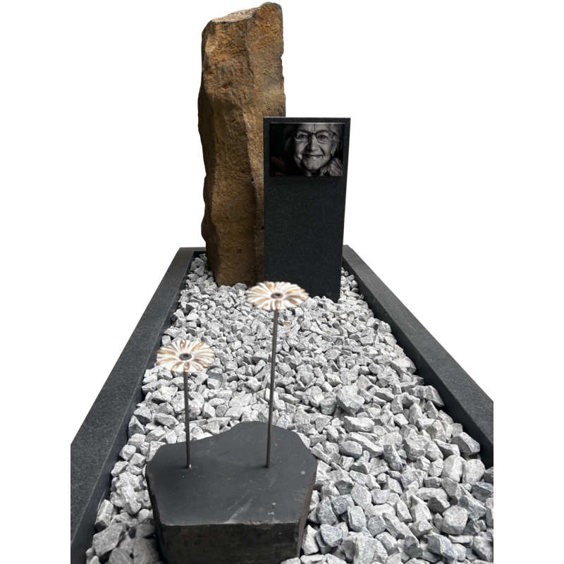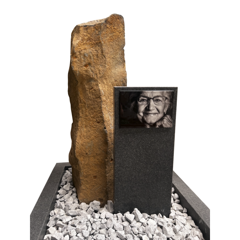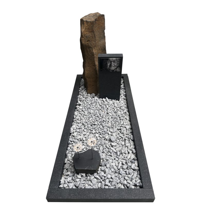 BeschrijvingGrafsteen zuilen met omranding en grote foto