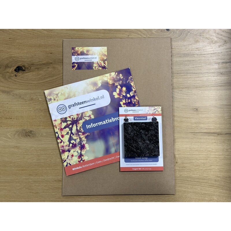 Een grafsteen kopen via een webshop kan heel makkelijk zijn, maar het ontneemt je de kans om de steen vooraf in het echt te bekijken. Grafsteenwinkel biedt je daarom de mogelijkheid om een gratis kleurstaal aan te vragen. Dit is een plaat die (binnen max. 3 werkdagen) per post naar je toegestuurd wordt. Op deze plaat kun je zelf een écht stuk natuursteen bekijken.