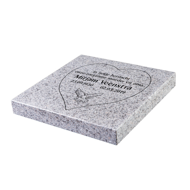 In deze variant van de liggende grafsteen is een hartvorm gezandstraald. Tegen een meerprijs van €125 t.o.v. de liggende grafsteen zonder hartvorm is deze mooie toevoeging beschikbaar.