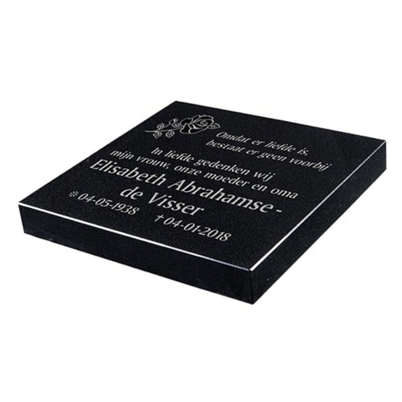 Wanneer je een liggende grafsteen in een donkere kleur wilt, dan is Zwart graniet een goede keuze. Het graniet is diepzwart en de kleur blijft ook na jaren op de begraafplaats mooi. Op de kleur Zwart graniet adviseren wij de tekstkleur wit of zilver omdat deze kleuren het grootste contrast geven. Uiteraard kan er ook voor een andere tekstkleur gekozen worden.