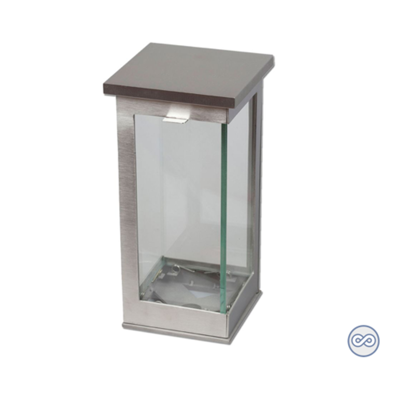 Deze zilverkleurige lantaarn heeft rechte hoeken en aan alle vier de kanten raampjes. Zo kan de kaars van alle kanten bekeken worden. Een lantaarn wordt vaak op een graf geplaatst zodat er een kaars gebrand kan worden zonder dat het risico bestaat dat er kaarsvet op de grafsteen komt wat lastig te verwijderen is. De lantaarn is 25 centimeter hoog.