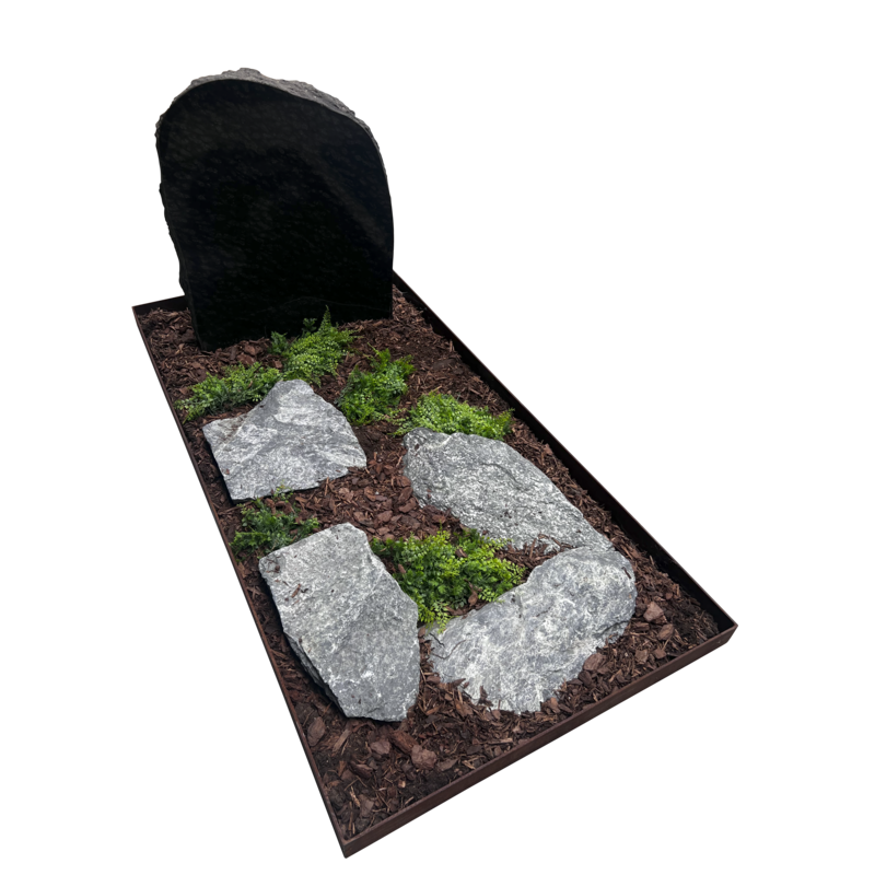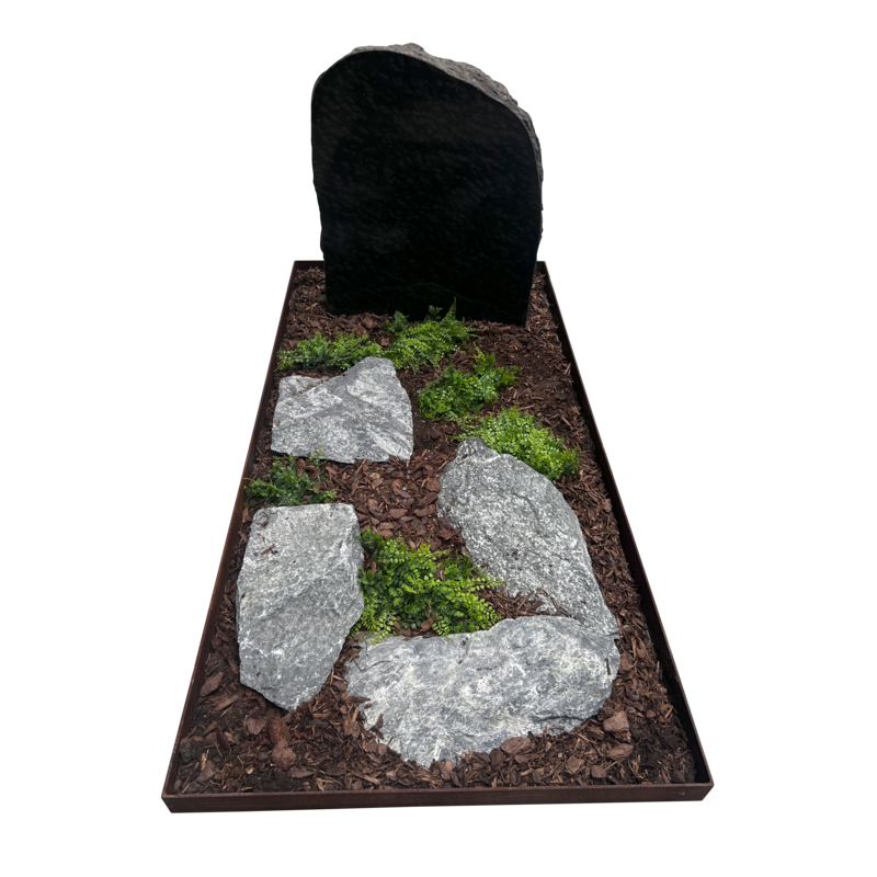 BeschrijvingRuwe vorm grafsteen met cortenstalen omranding en keien