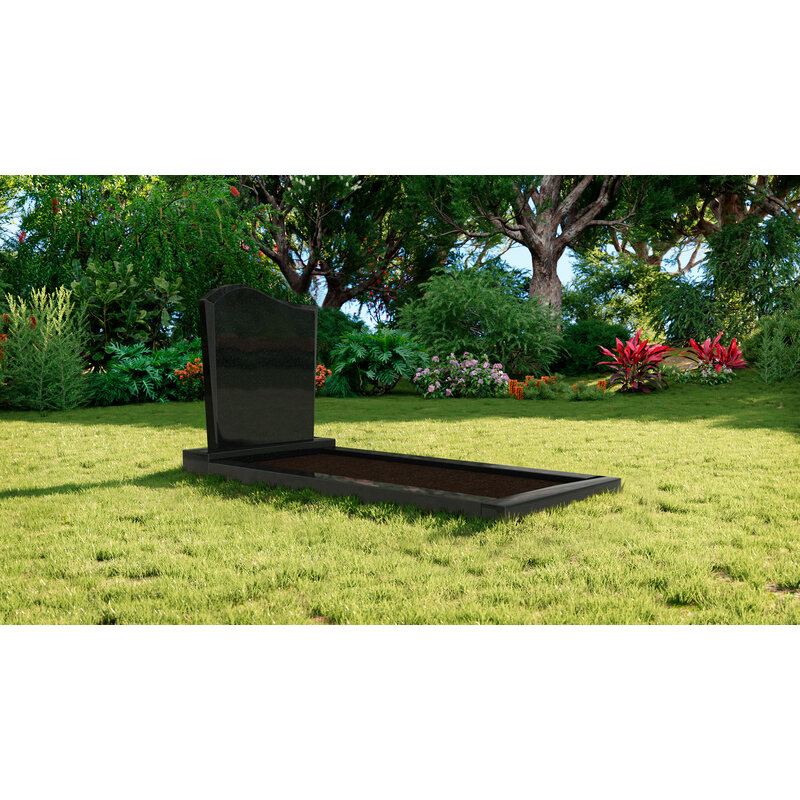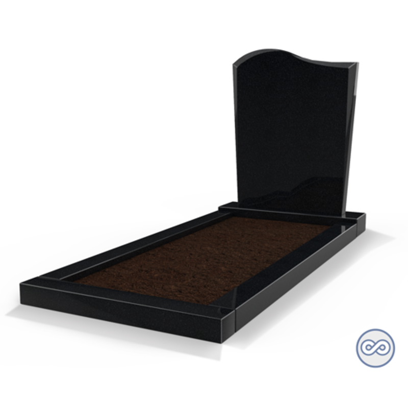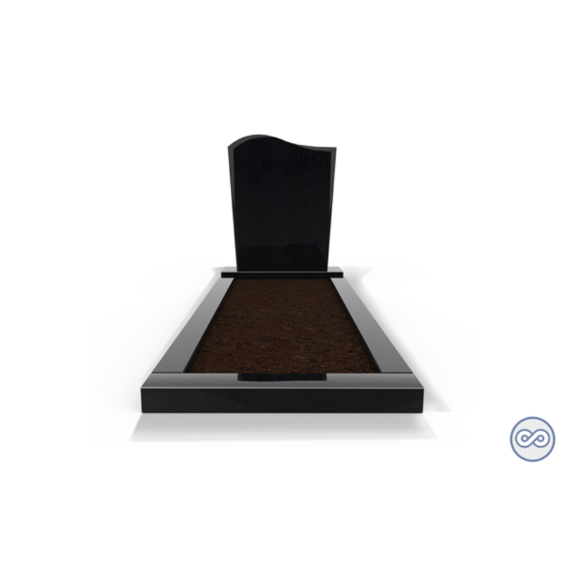 Staande grafsteen model 'Golf' met omranding en grond in de kleur Zwart Graniet