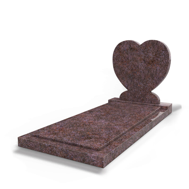 Een afdekplaat bij een staande grafsteen vormt een geheel waar geen onderhoud aan is. Deze grafsteen in hartmodel is uitgevoerd in Himalaya Blue graniet. Dit is een harde graniet soort, wat betekent dat het graniet kleurvast is. De kleur Himalaya Blue laat zich het beste omschrijven als roze/rood met bruine/zwarte/grijze tinten erin. Voor de kleur van de tekst raden wij aan om deze te kiezen in wit of zilver, dit is het beste leesbaar op het Himalaya Blue graniet. De tekst wordt verdiept in de steen gezandstraald en met verf ingekleurd.
